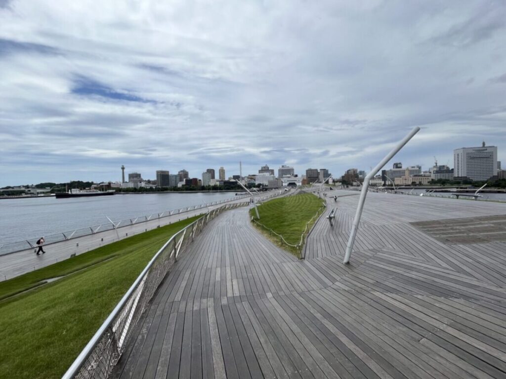 実は、右の方はもともと山下埠頭まで行く貨物線(山下臨港線)の跡です。そこを整備して、山下公園まで行ける歩道(山下臨港線プロムナード)にしたものです。